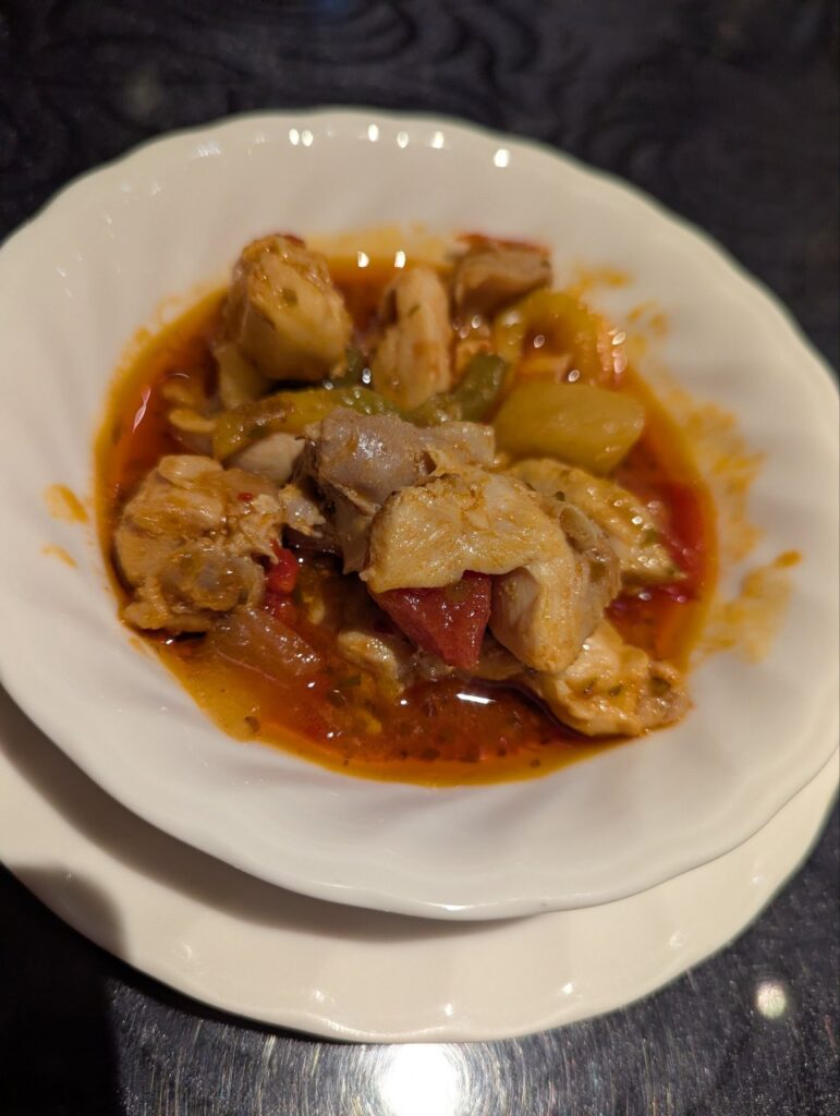 鳥の煮込み。なんだかピリ辛を想像していたら、ピリ辛ぽいのに、甘くておいしい。