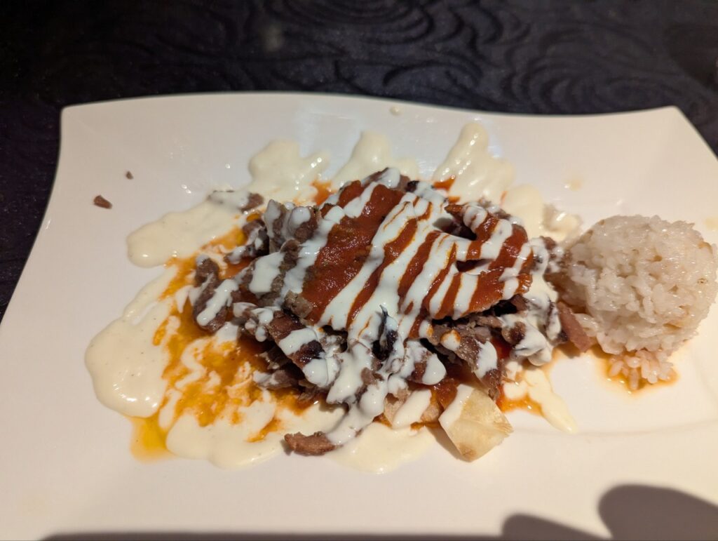 メインのケバブ。これも肉も柔らかく、ソースもさっぱりでおいしい。軽くて和食にはないお味。