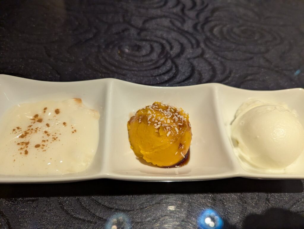 あっという間にデザート。トルコアイスもちろん出ました。一番右です。こちらも美味でした。真ん中は、かぼちゃのちょっと甘い味付けのデザート。左側は、プリンみたいに甘いお味でプリンみたい。