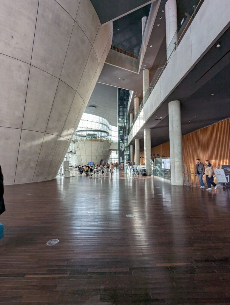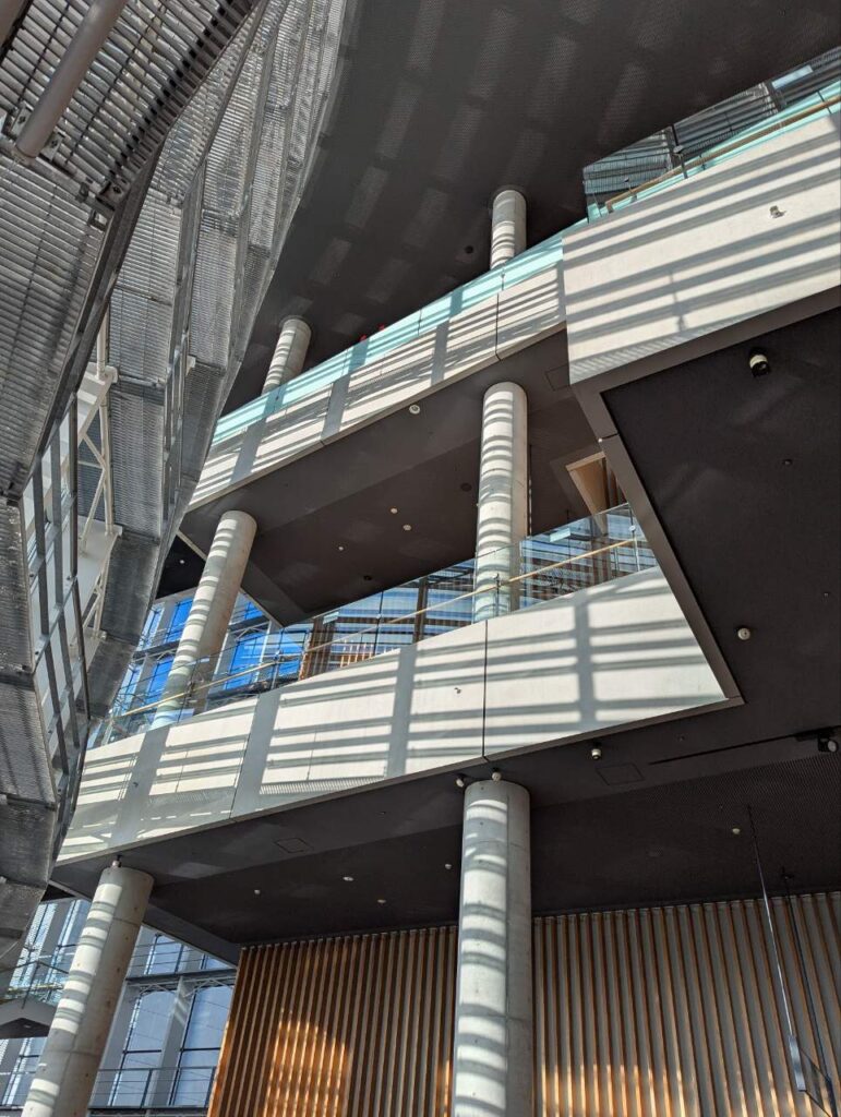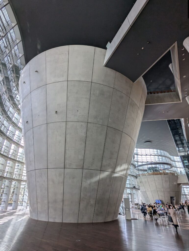 これなんて、どうでしょうか。ガラスで出来た外壁のうねり具合と、コンクリートの筒のような壁が手前と奥で2つ。そして見上げると橋のようなコンクリートの渡り廊下。そして床はフローリング。